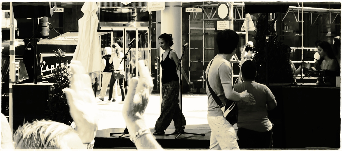 Für uns, die wir auf der Bühne standen, eine Herausforderung der besonderen Art – inmitten von Lärm und Passanten, die sich kreuz und quer zwischen Publikum und Bühne durchschieben, seine Performance abzuliefern, ist nicht ohne!