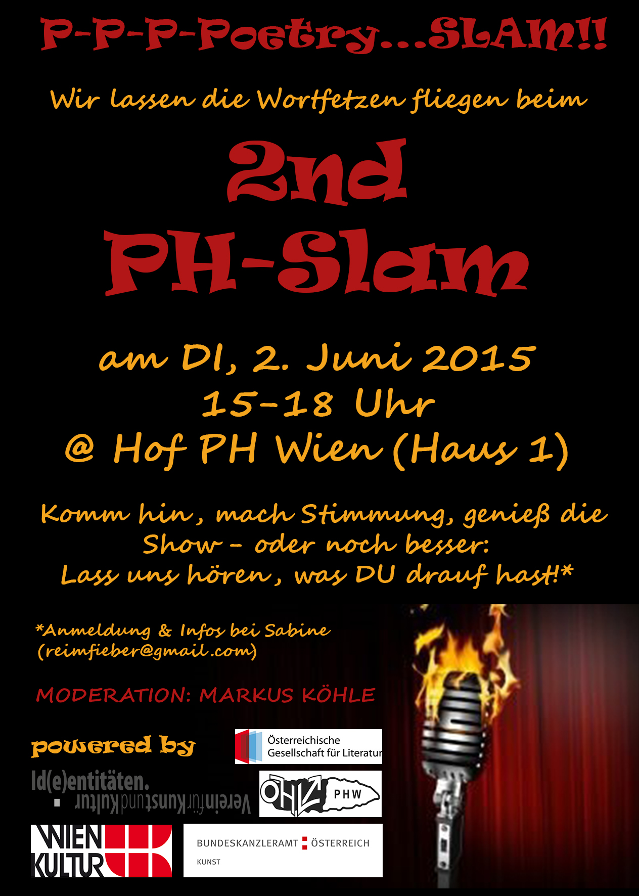Mai: Letzte Vorbereitungen für den 4. PH-Slam. Als Hauptorganisatorin hatte ich zuletzt eine Menge zu tun (Bücherspenden besorgen, Förderanträge schreiben, mich um die Bewerbung kümmern mit Flyern, Plakaten, Mundpropaganda, Facebook, ÖH-Newsletter usw.) und dann? Was dann?!